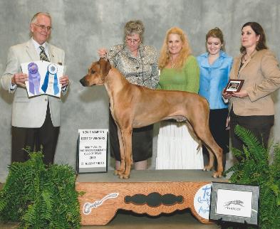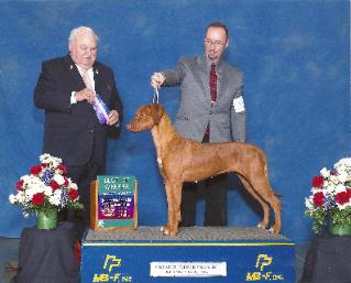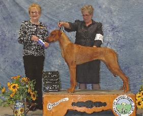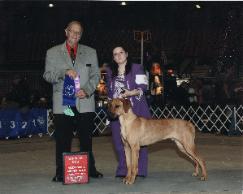 WOOOOP THERE IT IS......Sunday February 3, 2013 finds Sonny in Pine Bluff, AR taking a BOB win over a Special !!! Congrats to Heather and Sonny for this very impressive win from the puppy 6-9 month class. On this same day Vi-Vi finished out her National and International Puppy Championships with all SG-1 scores, 4 BPYB wins and 4 Puppy Hound Group 1's.